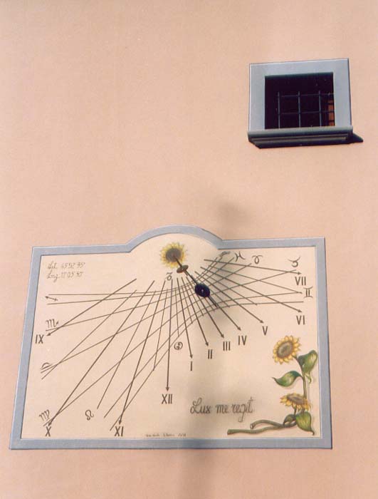 | Elegante meridiana riportante tutte le linee diurne dei segni zodiacali e con lo stilo polare. Come si può notare, la decoratrice Lisa, che ha dipinto l'orologio solare, ha ripreso nella cornice i motivi pittorici degli stipiti delle finestre ed ha abbellito il tutto con bellissimi girasoli. |